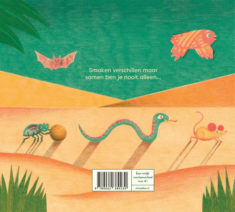Een vrolijk voorleesverhaal over vriendschap. Op een gewone dag ontdekt een dromedaris een prachtige oase. Daar wil hij heen en natuurlijk moet zijn goede vriend mee. Al snel trekt er een bonte stoet dieren door de woestijn: op zoek naar dit wonderlijk oord. Maar hebben ze eigenlijk wel hetzelfde doel voor ogen? Smaken kunnen verschillen maar samen ben je nooit alleen.