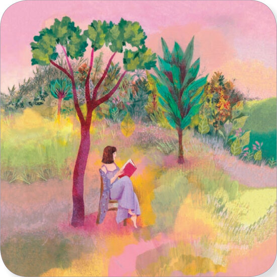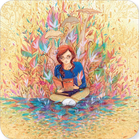 Boek lezen, Jehanne Weyman, vierkantAnsichtkaart, enkele kaart, postkaart van 14 x 14 cm met envelop van 14,6 x 14,6 cm.